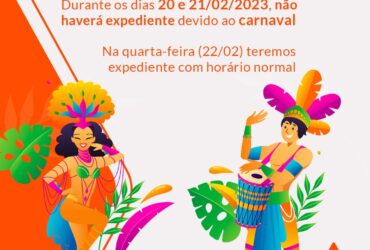 Durante os dias 20 e 21/02/2023, não haverá expediente devido ao carnaval. Na quarta-feira (22/02) teremos expediente co…