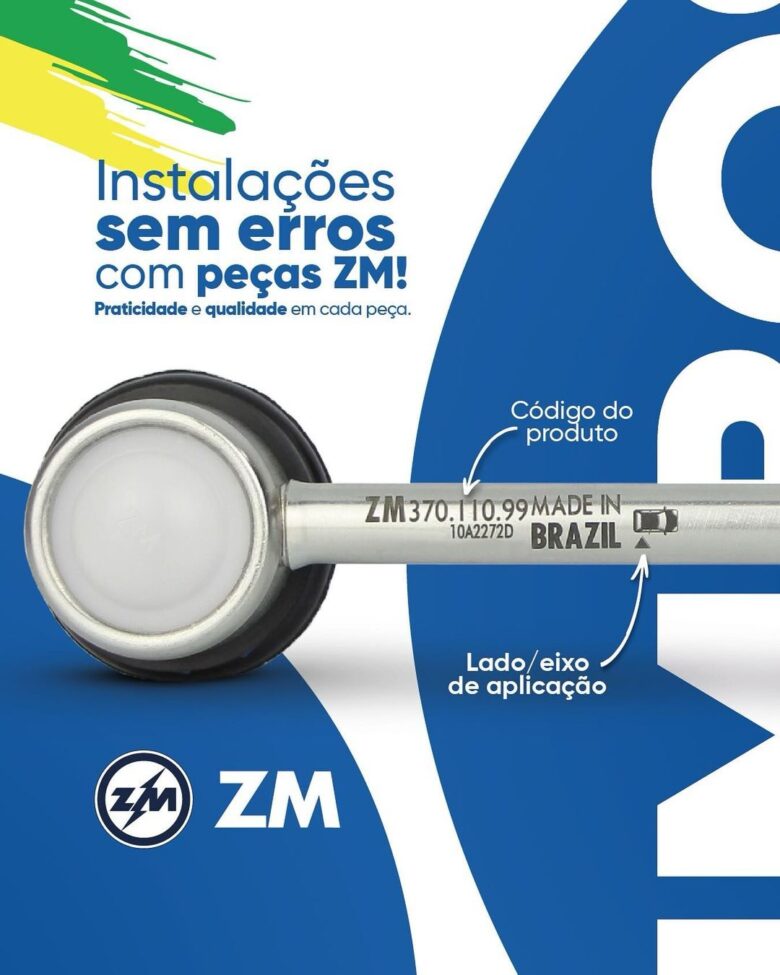 Cada peça da linha de Suspensão e Direção ZM é detalhadamente identificada com desenho de um veículo acompanhado por setas indicativas que especificam claramente o lado/eixo correto de aplicação, seja direita, esquerda, dianteira, traseira ou ambos. Esta marcação técnica é projetada para assegurar a montagem correta, minimizando a possibilidade de erros e garantindo a integridade e segurança do processo de instalação. 🔧