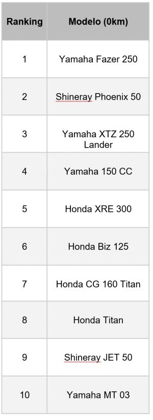 Entre as motos 0km o ranking é liderado pela Yamaha Fazer 250, seguida da Shineray Phoenix 50 e da Yamaha XTZ 250 Lander. A lista é dominada pela Honda e Yamaha, com três e quatro modelos de cada fabricante no top 10, respectivamente. “Das dez motocicletas mais procuradas, oito são de até 250 cilindradas. Isso mostra que os consumidores têm focado em modelos para deslocamentos mais curtos, dentro das cidades”, conta Luciano.