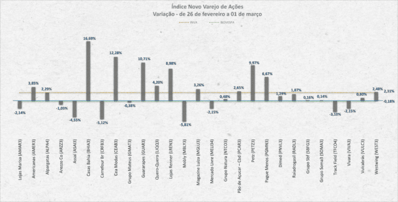 Pela segunda semana consecutiva, média do desempenho das ações do varejo superou com folga a performance do Ibovespa