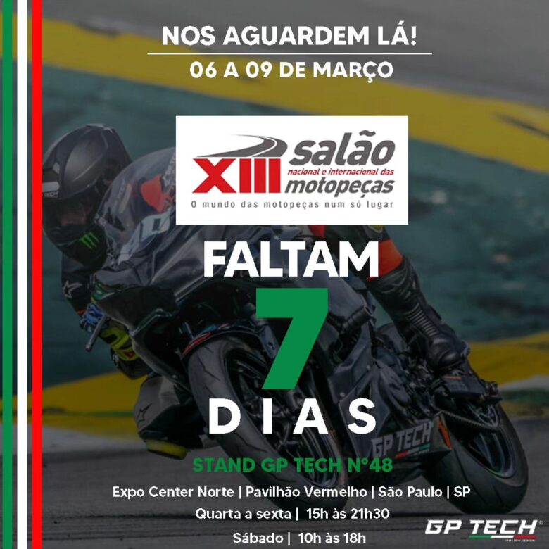 Em apenas 7 dias estaremos no Expo Center Norte, Pavilhão Vermelho, para o grande Salão Motopeças. Venhas nos visitar no stand número 48, de 6 a 9 de março, para descobrir o que preparamos para vocês. 🏍🔥
