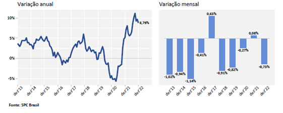 Em relação ao aumento do endividamento no Brasil, o indicador mostra que em dezembro de 2022 houve crescimento de 19,60% em relação ao mesmo período de 2021. O dado observado em dezembro deste ano ficou abaixo da variação anual observada no mês anterior. Na passagem de novembro para dezembro, o número de dívidas apresentou recuo de -0,62%