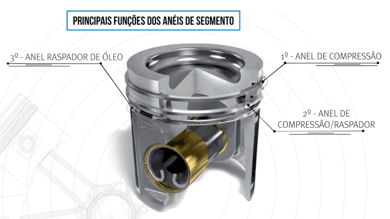 O anel da primeira canaleta, conhecido por anel de compressão, tem a função de realizar a vedação dos gases de combustão entre a câmara e o cárter do motor. Já o anel da segunda canaleta, denominado raspador, também promove a vedação e auxilia no controle do filme de óleo no cilindro. O anel da terceira canaleta – “anel de óleo” – controla a quantidade de óleo na superfície do cilindro, mantendo a película com espessura entre 1 e 2 microns.