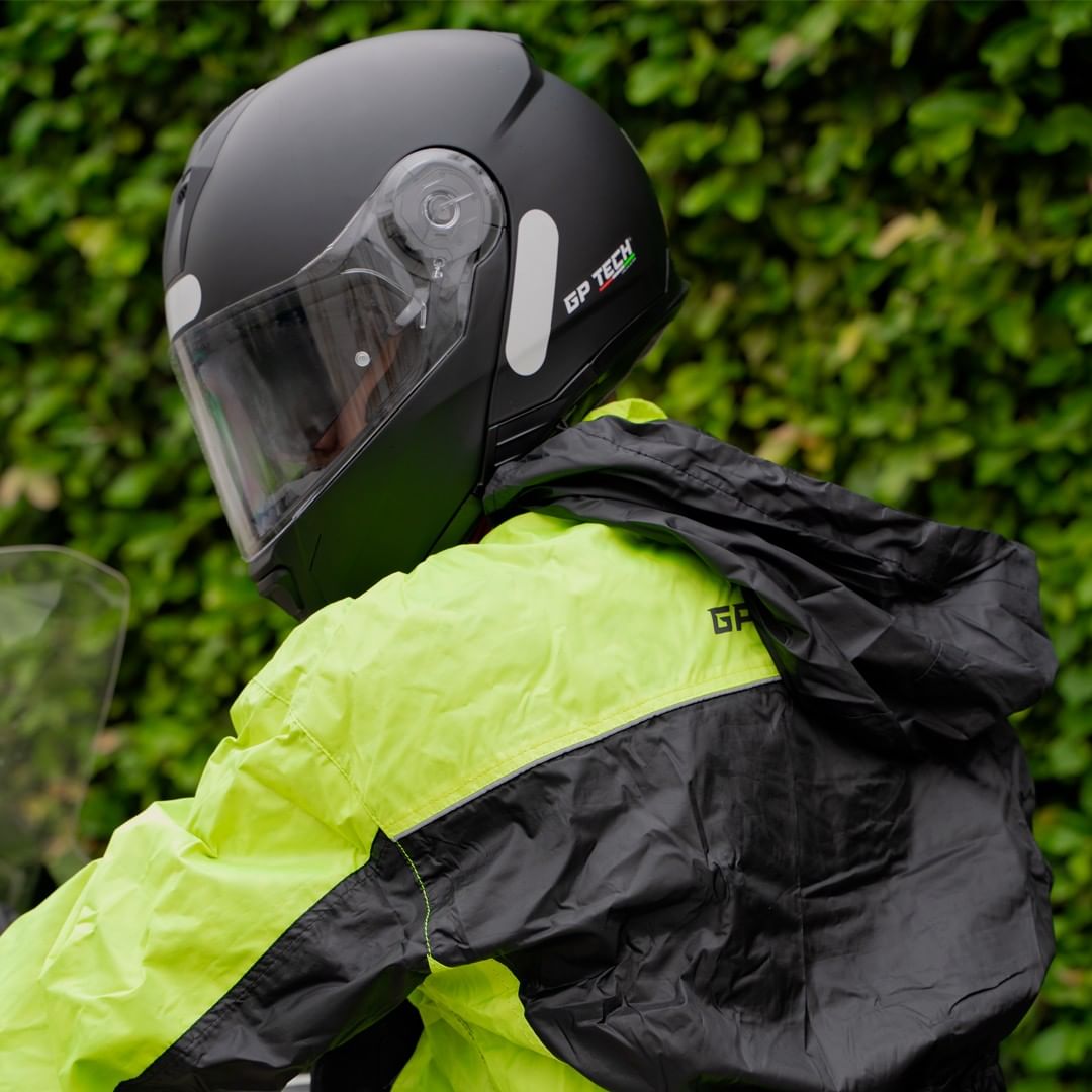 Pronto para acelerar na cidade com Gp Tech! 😎 Capacete: Mono Articulado Robocop Fosco A118 SV 🪖 Capa de chuva: Pioggi…