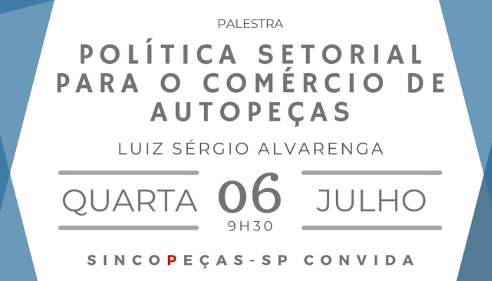 Essa é a sinopse da palestra “Política setorial para o comércio de autopeças”, que será apresentada pelo diretor da Alvarenga Projetos Automotivos, Luiz Sérgio Alvarenga, no próximo dia 06 de julho, a partir das 9h30, no auditório do Sincopeças-SP, à avenida Paulista, 1.009, 5º andar.